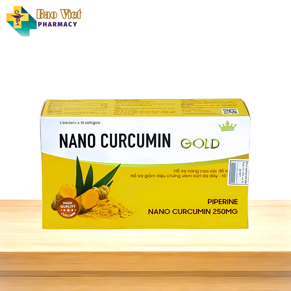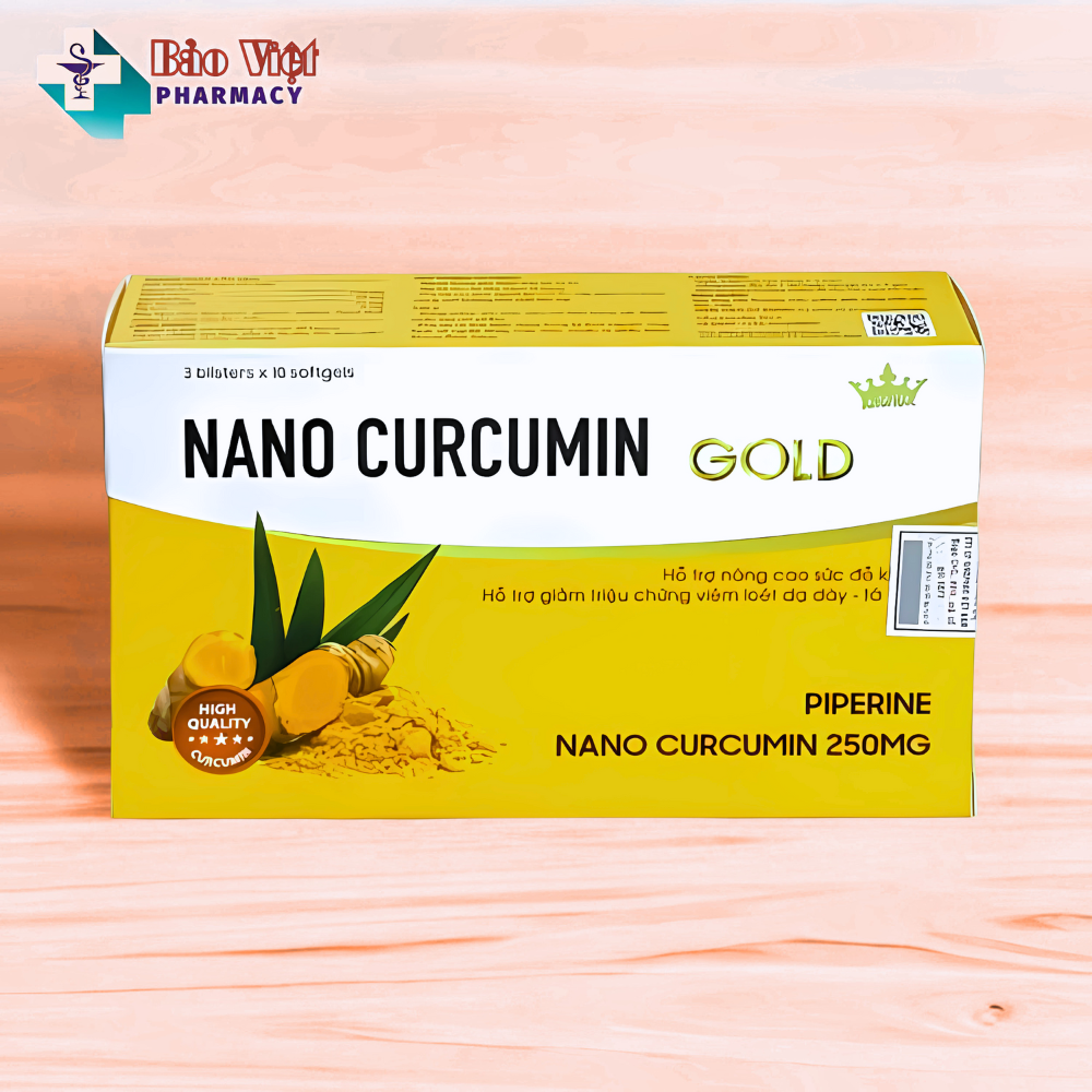 - Nano Curcumin Gold Kingphar là thực phẩm bảo vệ sức khỏe, có công dụng giúp hỗ trợ nâng cao sức đề kháng của cơ thể. Hỗ trợ bồi bổ cơ thể khỏe mạnh. Hỗ trợ làm giảm các triệu chứng của viêm loét dạ dày, tá tràng. Giúp hỗ trợ chồng oxy hóa và hỗ trợ bảo vệ dạ dày.