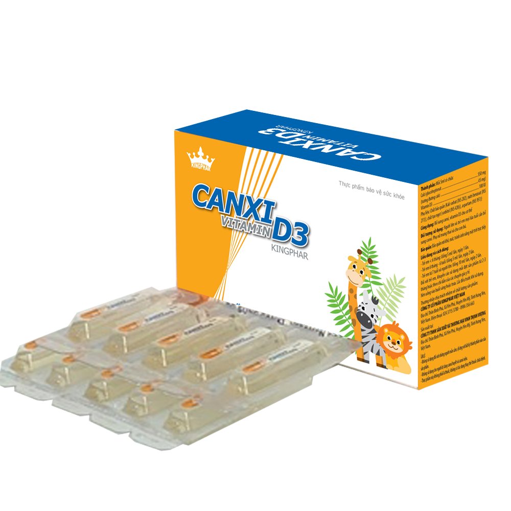 Canxi Vitamin D3 Kingphar bổ sung cho bé hàm lượng cao Canxi và Vitamin D3. Sản phẩm phù hợp với các bé còi xương do thiếu hụt canxi, hoặc có nhu cầu bổ sung canxi để phát triển chiều cao.