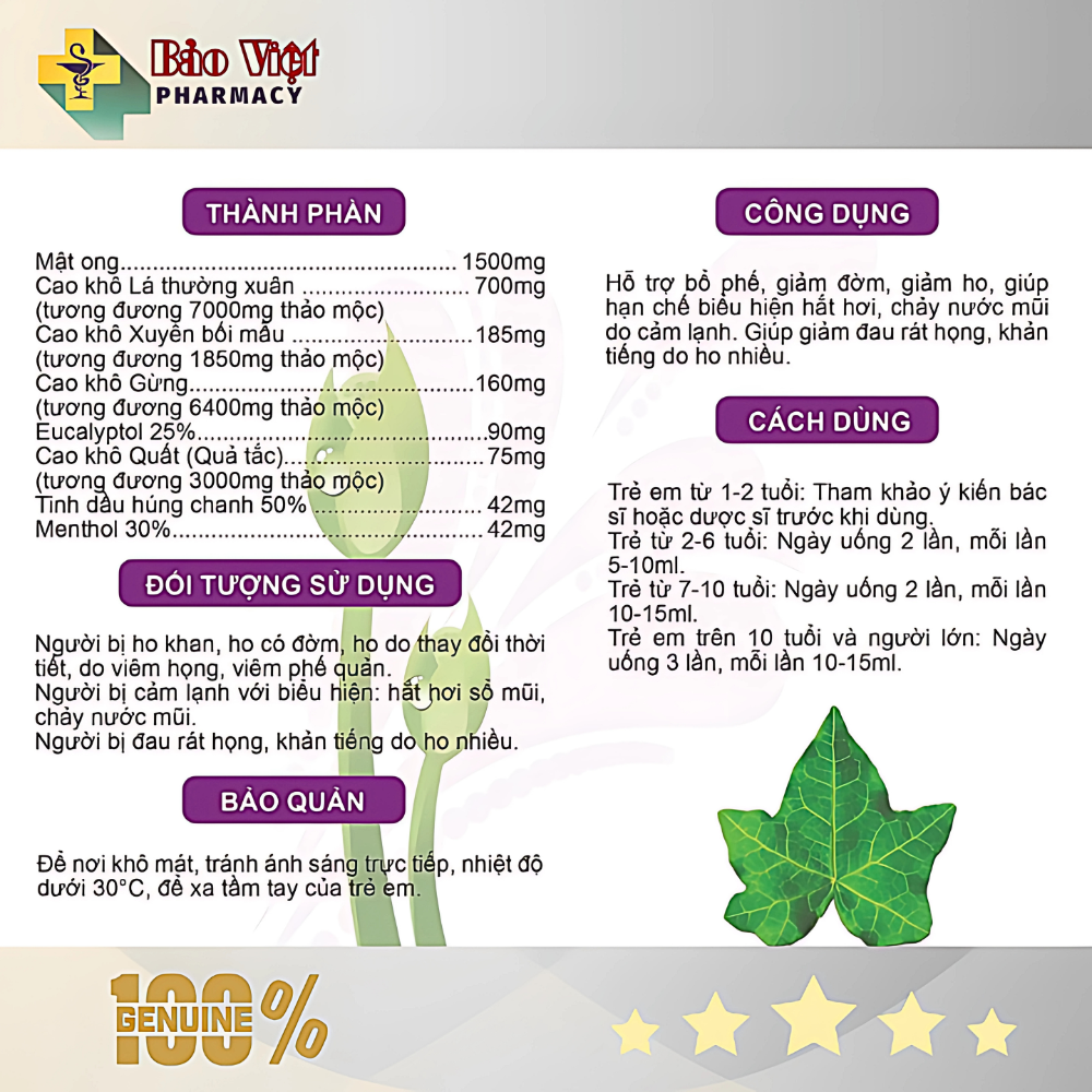 Trong 100ml siro có chứa những thành phần chính từ thiên nhiên, đảm bảo an toàn cho người sử dụng như: