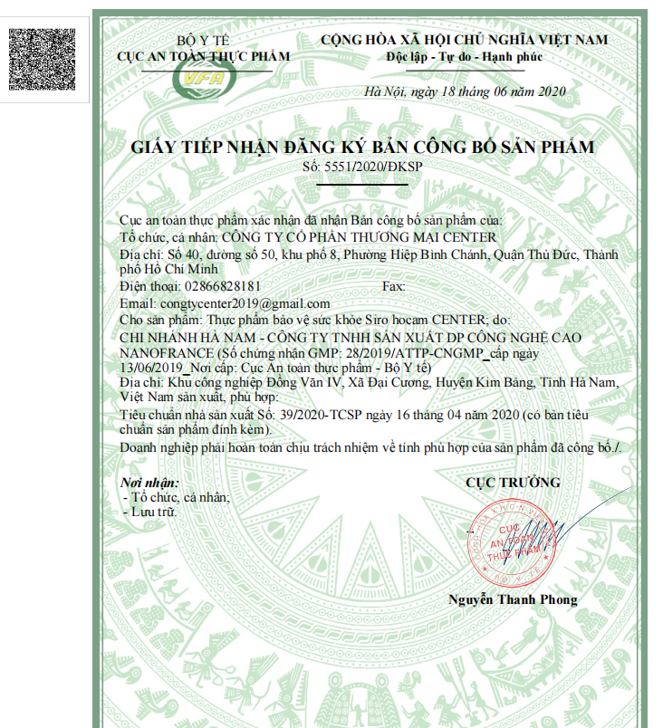 Lưu ý: Sản phẩm đã được Cục ATTP – Bộ Y Tế cấp phép dưới dạng thực phẩm sức khỏe lưu hành toàn quốc.