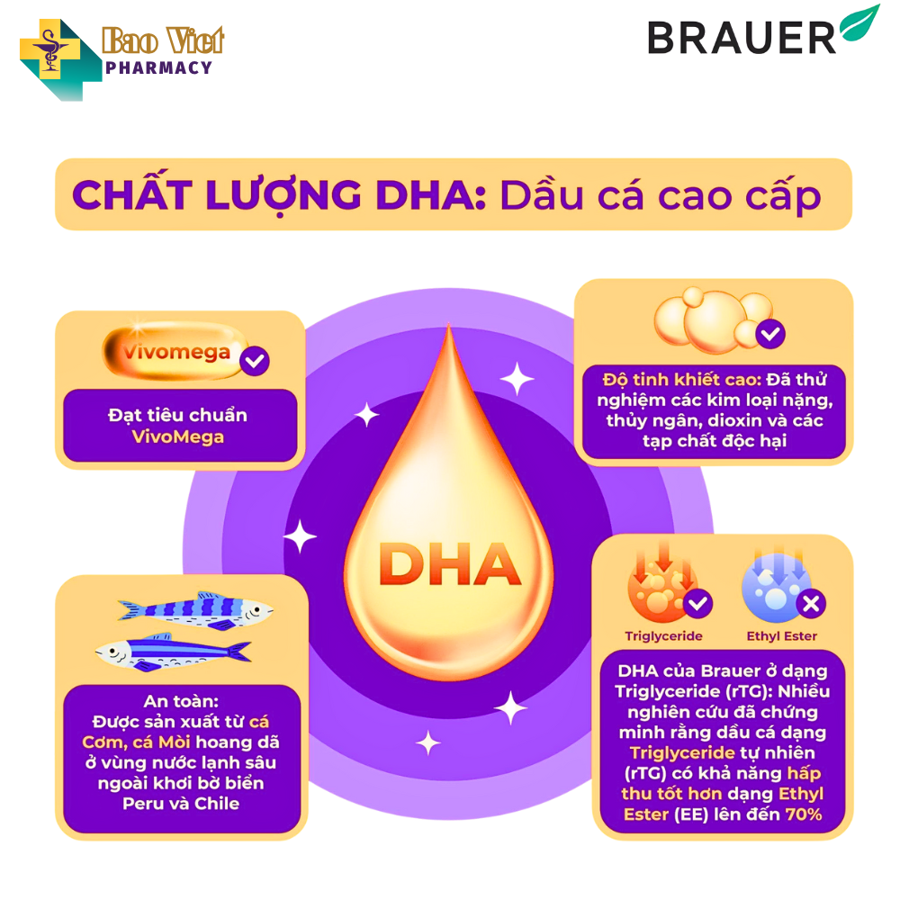 - Brauer Baby & Kids Ultra Pure DHA giúp bổ sung DHA và EPA cho cơ thể, hỗ trợ phát triển não bộ và sức khỏe cho mắt.