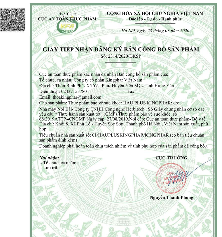 Sản phẩm Hàu Plus KingPhar đã được Cục An toàn Thực Phẩm cấp giấy chứng nhận sản phẩm bảo vệ sức khỏe và được Bộ Y Tế kiểm định và được cấp phép lưu hành trên toàn quốc.